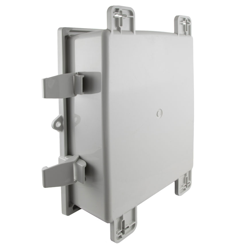 The box is a rugged weatherproof enclosure that is ideal for both indoor and outdoor applications. Constructed from High-Impact, UV Resistant Polycarbonate material that provides superior durability to impacts and ease of modification while maintaining minimum weight. It is well suited for high temperature or corrosive environments. The shallow depth design while maintaining industry standard height/width dimensions is ideal for low profile applications.