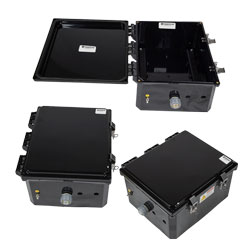 Our outdoor NEMA 4X rating enclosure is designed to be weatherproof for added protection of its important electronic and electrical components. The weatherproof NEMA box from Transtector provides watertight protection from the outdoors. This NEMA waterproof cabinet enclosure has an IP66 rating.