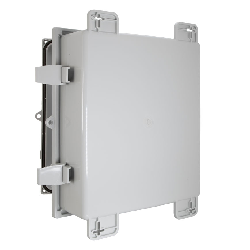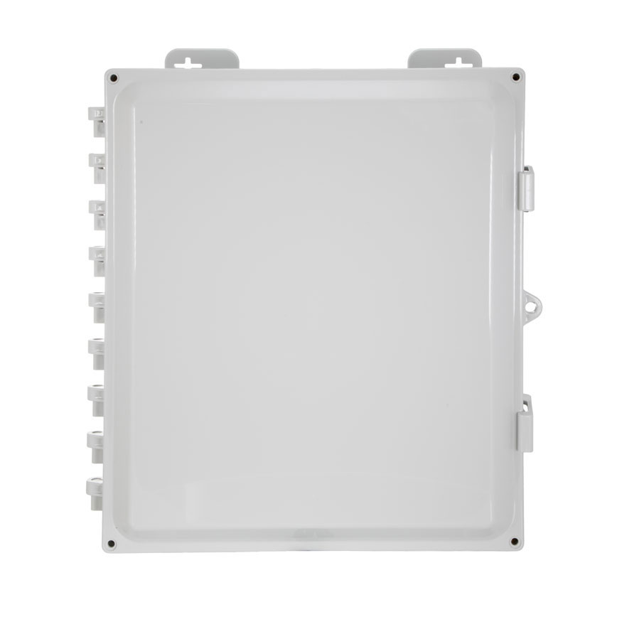 The box is a rugged weatherproof enclosure that is ideal for both indoor and outdoor applications. Constructed from High-Impact, UV Resistant Polycarbonate material that provides superior durability to impacts and ease of modification while maintaining minimum weight. It is well suited for high temperature or corrosive environments. The shallow depth design while maintaining industry standard height/width dimensions is ideal for low profile applications.