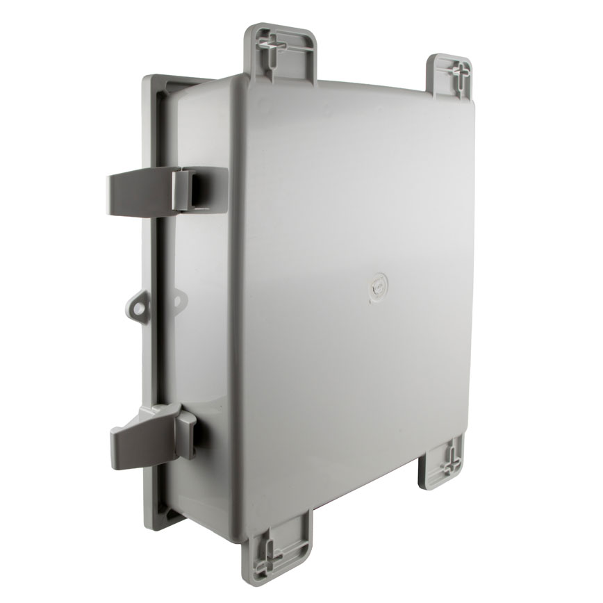 The box is a rugged weatherproof enclosure that is ideal for both indoor and outdoor applications. Constructed from High-Impact, UV Resistant Polycarbonate material that provides superior durability to impacts and ease of modification while maintaining minimum weight. It is well suited for high temperature or corrosive environments. The shallow depth design while maintaining industry standard height/width dimensions is ideal for low profile applications.