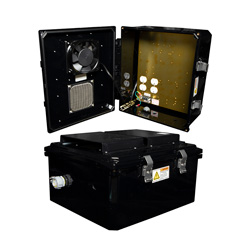 Industrial outdoor NEMA IP24 enclosure TEBPC141206-10F is built with 120V AC mounting plate powered. Our polycarbonate cabinet enclosure for outdoor use incorporates built-in fan cooled system. Transtector NEMA enclosure box with fan cooling is controlled by a mechanical thermostat circuit. TEBPC141206-10F outdoor IP24 NEMA 3R enclosure cabinet datasheet with details of specifications and CAD drawing with dimensions can be found in the PDF above.