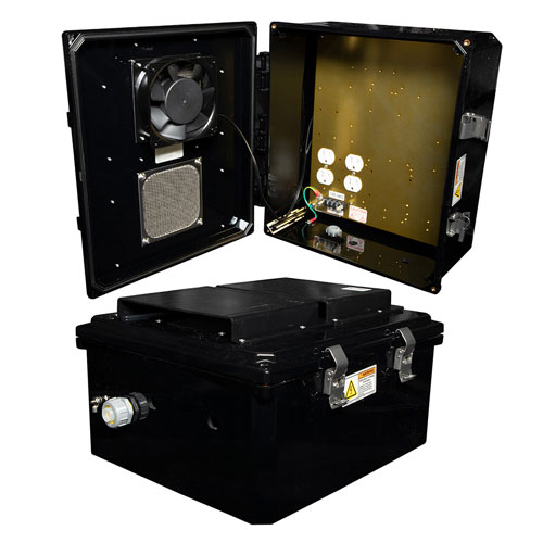 The TEBPC141206-10F-1-UL model includes a thermostat-controlled 16.4W fan. The high airflow, low noise fan used allows warm air to be actively pushed out while the lower vent passively pulls in outside air into the enclosure. Filters for both ports prevent foreign objects or debris from entering the enclosure. The fan turns on when the internal temperature rises to 85° F (29° C) ±5° and turns off at 67° F (19° C) ±10°. The cooling fan does not require the use of any of the AC outlets, leaving them all available for your equipment.