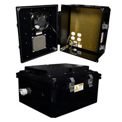 The TEBPC141206-10F-UL model includes a thermostat-controlled 16.4W fan. The high airflow, low noise fan used allows warm air to be actively pushed out while the lower vent passively pulls in outside air into the enclosure. Filters for both ports prevent foreign objects or debris from entering the enclosure. The fan turns on when the internal temperature rises to 120° F (49° C) ±5° and turns off at 90° F (32° C) ±10°. The cooling fan does not require the use of any of the AC outlets, leaving them all available for your equipment..