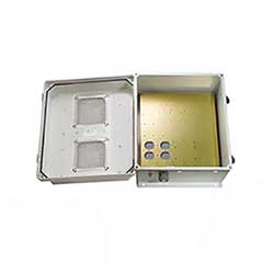 The box is a rugged weatherproof enclosure that is ideal for both indoor and outdoor applications. Constructed from molded fiberglass reinforced polyester, it is well suited for high temperature or corrosive environments. The integrated mounting flange allows it to be mounted directly to any flat wall surface provided proper screws are used into secure studs. The enclosure can also be mounted to a wide diameter range of poles with one of our optional pole mounting hardware kits. The raised lid features a stainless steel continuous hinge and stainless steel quick release latches with padlock hasps. Includes fully gasketed vented lid with filters & integral mounting flange. The enclosure material is UV stabilized and comes in machine tool gray.