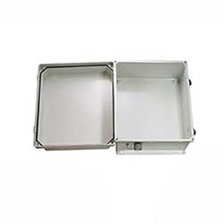The box is a rugged weatherproof enclosure that is ideal for both indoor and outdoor applications. Constructed from molded fiberglass reinforced polyester, it is well suited for high temperature or corrosive environments. The integrated mounting flange allows it to be mounted directly to any flat wall surface provided proper screws are used into secure studs. The enclosure can also be mounted to a wide diameter range of poles with one of our optional pole mounting hardware kits. The raised lid features a stainless steel continuous hinge and stainless steel quick release latches with padlock hasps. Includes fully gasketed lid & integral mounting flange. The enclosure material is UV stabilized and comes in machine tool gray.
