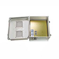 The box is a rugged weatherproof enclosure that is ideal for both indoor and outdoor applications. Constructed from molded fiberglass reinforced polyester, it is well suited for high temperature or corrosive environments. The integrated mounting flange allows it to be mounted directly to any flat wall surface provided proper screws are used into secure studs. The enclosure can be also be mounted to a wide diameter range of poles with one of our optional pole mounting hardware kits. The raised lid features a stainless steel continuous hinge and stainless steel quick release latches with padlock hasps. Includes fully gasketed vented lid with filters & integral mounting flange. The enclosure material is UV stabilized and comes in machine tool gray.