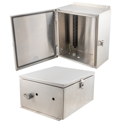 Our national electrical manufactures association NEMA box has the outer dimensions of 14x12x7. The 14x12x7 NEMA enclosure box inner dimensions are 14.4x12x7.69. Transtector 4X rating NEMA IP66 enclosure panel part number TESS141207-000DR is constructed of 304 stainless steel. This 304 stainless steel enclosure box is designed to adhere to the national electrical manufacturers association NEMA ratings.