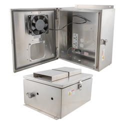 Industrial outdoor NEMA IP24 enclosure TESS141207-EHF is built with 240V AC universal outlet mounting plate. Our 304 stainless steel cabinet enclosure for outdoor use incorporates built-in fan cooled system. Transtector NEMA enclosure box with fan cooling is controlled by a mechanical thermostat circuit. TESS141207-EHF outdoor IP24 NEMA 3R enclosure cabinet datasheet with details of specifications and CAD drawing with dimensions can be found in the PDF above.