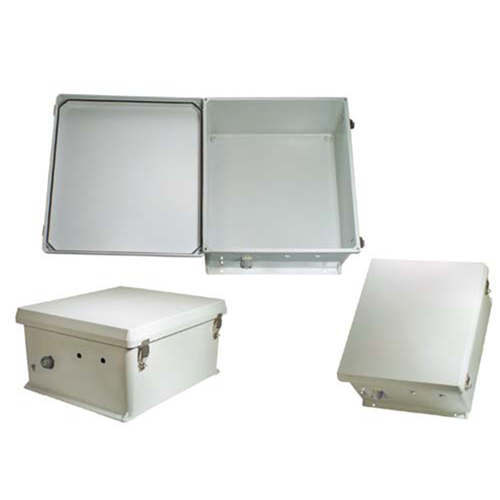 Our plastic outdoor NEMA 4 rating enclosure is designed to be weatherproof for added protection of its important electronic and electrical components. The weatherproof NEMA box from Transtector provides watertight protection from the outdoors. This NEMA waterproof cabinet enclosure has an IP66 rating.