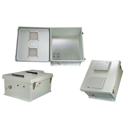 Our plastic outdoor NEMA 3R rating enclosure is designed to be weatherproof for added protection of its important electronic and electrical components. The weatherproof NEMA box from Transtector provides watertight protection from the outdoors. This NEMA waterproof cabinet enclosure has an IP24 rating.
