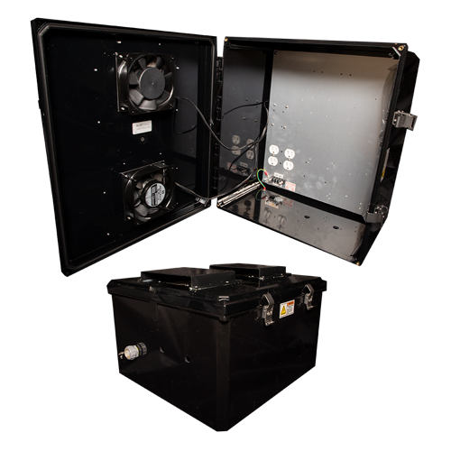 Industrial outdoor NEMA IP24 enclosure TEBPC181610-10FSX is built with 120V AC mounting plate powered. Our polycarbonate cabinet enclosure for outdoor use incorporates built-in dual fans cooled system. Transtector NEMA enclosure box with dual fans cooling is controlled by a solid state thermostat circuit. TEBPC181610-10FSX outdoor IP24 NEMA 3R enclosure cabinet datasheet with details of specifications and CAD drawing with dimensions can be found in the PDF above.