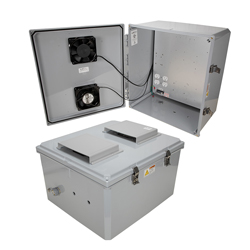 Industrial outdoor NEMA IP24 enclosure TEPC181610-10FSX is built with 120V AC mounting plate. Our polycarbonate cabinet enclosure for outdoor use incorporates built-in dual fans cooled system. Transtector NEMA enclosure box with dual fans cooling is controlled by a solid state thermostat circuit. TEPC181610-10FSX outdoor IP24 NEMA 3R enclosure cabinet datasheet with details of specifications and CAD drawing with dimensions can be found in the PDF above.