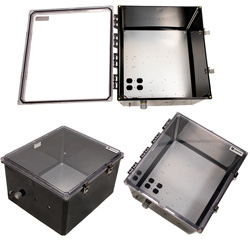 Our national electrical manufactures association NEMA box has the outer dimensions of 18x16x10. The 18x16x10 NEMA enclosure box inner dimensions are 18.2x16.2x9.7. Transtector 4X rating NEMA IP66 enclosure panel part number TEBWPC181610-01 is constructed of polycarbonate. Our NEMA 4X rating polycarbonate enclosure cabinet is black in color. This black polycarbonate enclosure box is designed to adhere to the national electrical manufacturers association NEMA ratings.