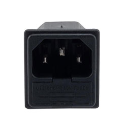 Our AC PEM nylon 66 connector features a 2.8 mm solder termination and snaps onto a 1.0 mm thick panel. The Transtector ACM-C4-N10SF-TT snap-fit panel mount IEC inlet connector AC power entry module can withstand cold conditions in the temperature range of -40 to +70 degrees Celsius. This UL-certified, ROHS-compliant IEC connector is made of nylon 66 with UL94V-0 flammability ratings.