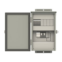 Small cell/5G/DAS electrical power protection cabinet (also known as power distribution box) SC-2MMA9-8602-NMN28C from Transtector, is a UL67 Listed service entrance rated power distribution box that accepts a 120/240 Vac split-phase electrical service, and distributes power from a 100A shunt trip main breaker to individual loads via 14 field configurable 1 – 25A branch circuit breaker positions. Transtector electrical cabinets are available in stock with same day shipping.