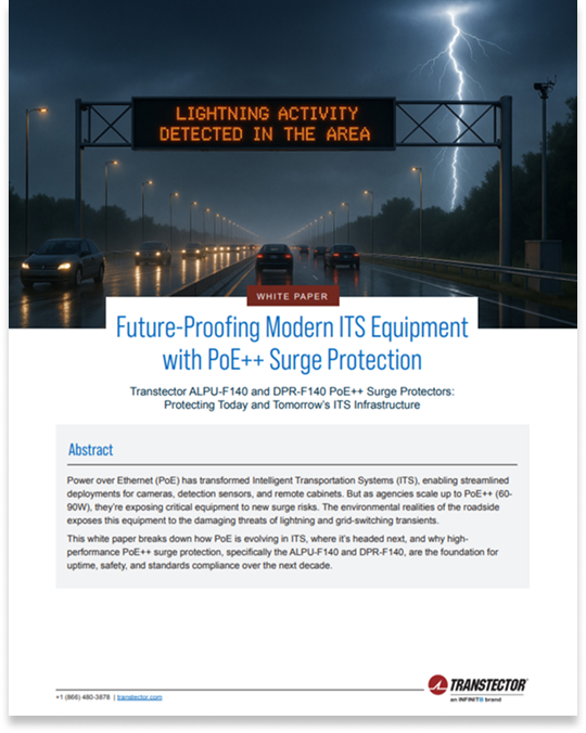 Intelligent Transportation SystemsSee how Transtector’s surge protection solutions protect and improve key ITSs. From intersections to toll booths, our technologies help ensure safe, efficient traffic flow by protecting critical infrastructure while also minimizing costly downtime. Real-World Surge Protection for ITS ApplicationsDownload our flyer for a quick look at how FDOT-approved surge protection solutions from Transtector can be implemented in real-world ITS installations. Explore NowORDER FORM Request Your FDOT-Approved Sample Now!FDOT - Approved Solutions